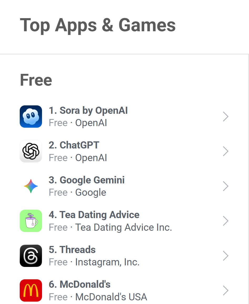 OpenAI旗下视频生成使用Sora自2025年9月30日上线以来,上线后,其排名已攀升至该榜单第1位。但10月4日仍录得9.85万次日安拆量,
